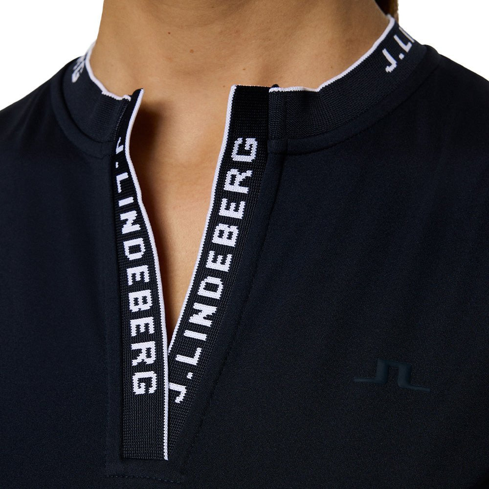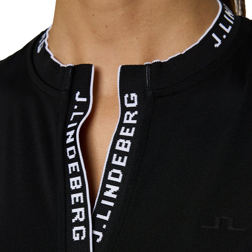 Freedom to move, style to spare. The Leya Top features a jacquard ribbed collar, contoured side panels, and technical stretch fabric. Lightweight, moisture-wicking, and ready for warm-weather play.